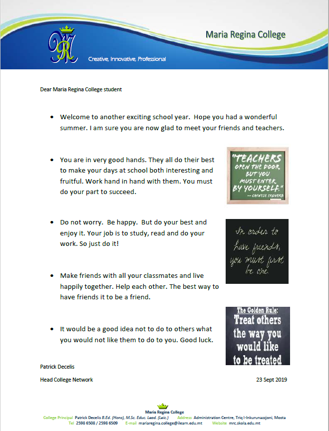 A meeting ‘The transition from Primary to Secondary Education’ was held on Friday 7th December 2019 for all Year 6 parents. Apart from the choice of language, the speakers Mr Giosue Pianciamore and Ms Anthea Vella, both Career advisors at Maria Regina College, focused also on important factors that can help students succeed in their studies.